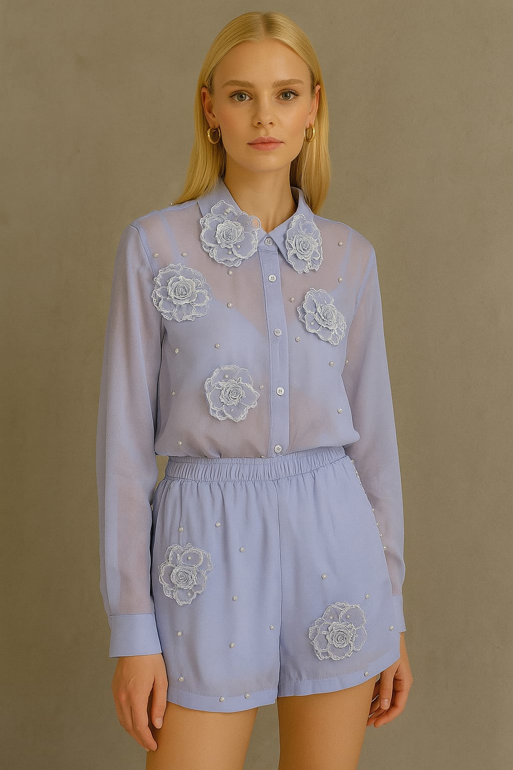 Conjunto de 2 piezas Short y Blusa morado con flores de tela 3D de botones
